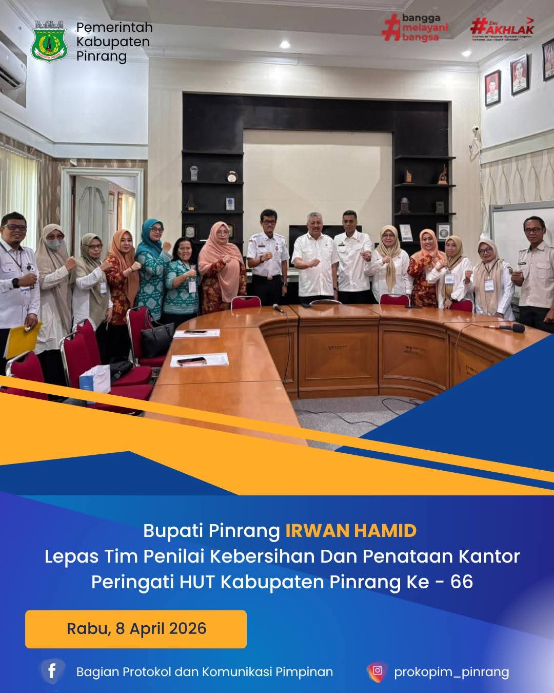 MEGATRENDNEWS.ID, PINRANG — Bupati Pinrang, Irwan Hamid, secara resmi melepas Tim Penilai Kebersihan dan Penataan Kantor Lingkup Pemerintah Kabupaten Pinrang dalam rangka memperingati Hari Ulang Tahun (HUT) ke-66 Kabupaten Pinrang. Kegiatan tersebut berlangsung pada Rabu (8/4/2026) di Ruang Rapat Sekretaris Daerah Kabupaten Pinrang.