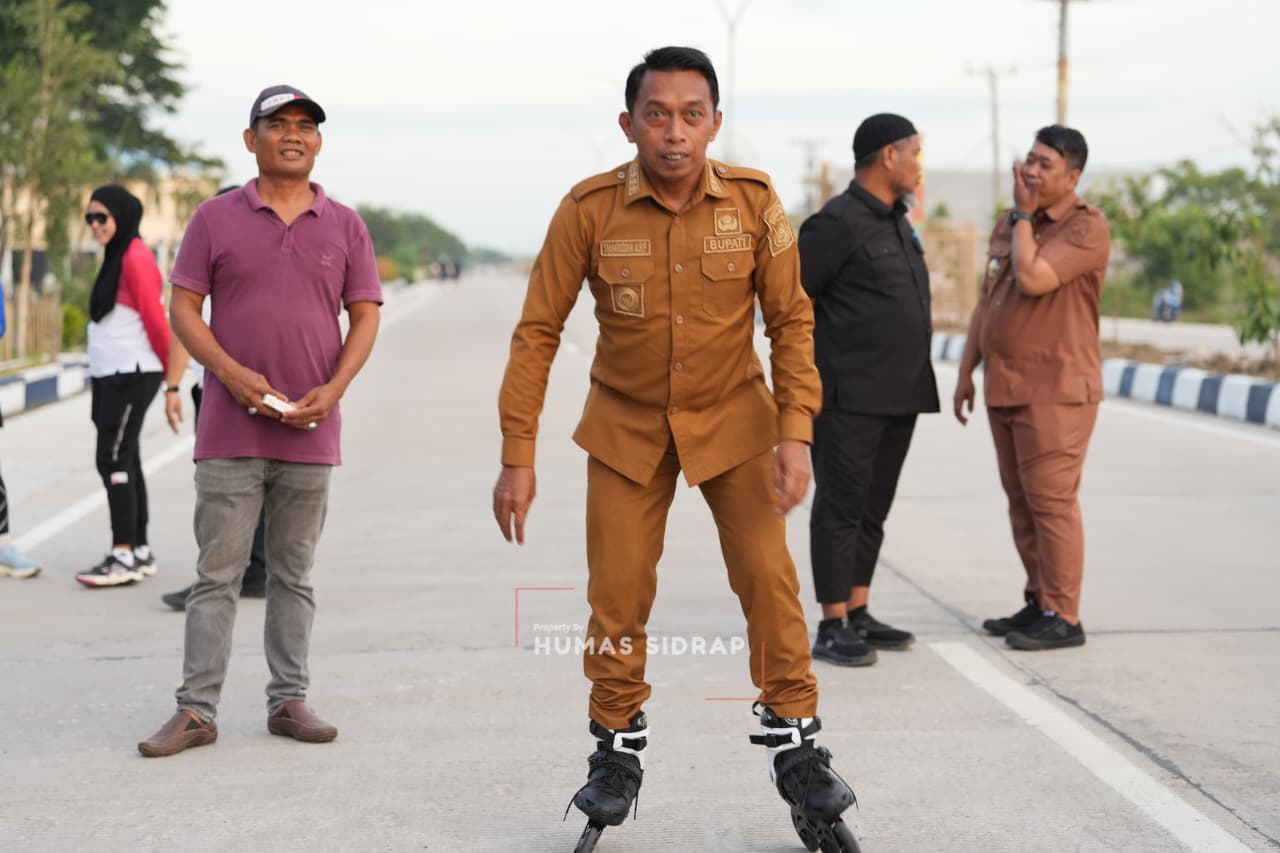 Suasana semakin hangat ketika Bupati mencoba bermain sepatu roda inline skating. Aksi spontan tersebut disambut antusias oleh warga yang ikut tersenyum dan memberi semangat.