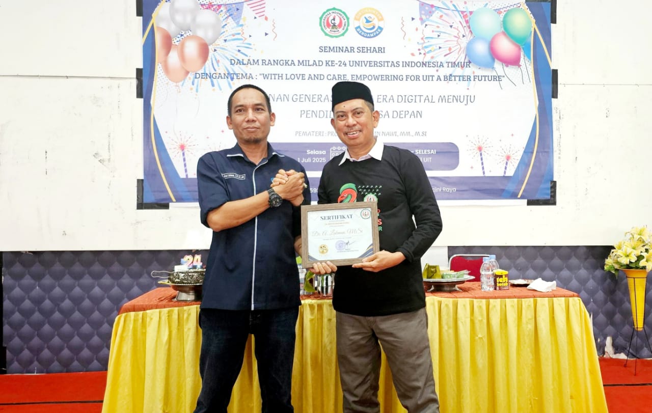 MEGATRENDNEWS.ID, MAKASSAR — Perayaan Milad ke-24 Universitas Indonesia Timur (UIT) Makassar berlangsung meriah dan penuh makna, Selasa (1/7/2025). Bertajuk “With Love and Care: Empowering for UIT a Better Future”, acara ini bukan hanya menjadi momentum reflektif bagi sivitas akademika UIT, tetapi juga mencatat sejarah baru, yakni Kepala LLDIKTI Wilayah IX Sultanbatara, Dr. Andi Lukman, M.Si, membuka perayaan sekaligus menerima penghargaan sebagai Alumni Terbaik dan Inovatif UIT.