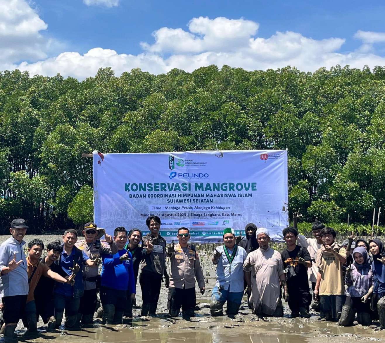 MEGATRENDNEWS.ID, MAROS — Dalam rangka memperingati Hari Kemerdekaan Republik Indonesia ke-80, Pelindo Regional 4 Makassar bersama Badan Koordinasi Himpunan Mahasiswa Islam Sulawesi Selatan (BADKO HMI Sulsel) menggelar aksi penanaman pohon mangrove di pesisir Dusun Binanga Sangkara, Desa Ampekale, Kecamatan Bontoa, Kabupaten Maros, Minggu (31/8/2025).