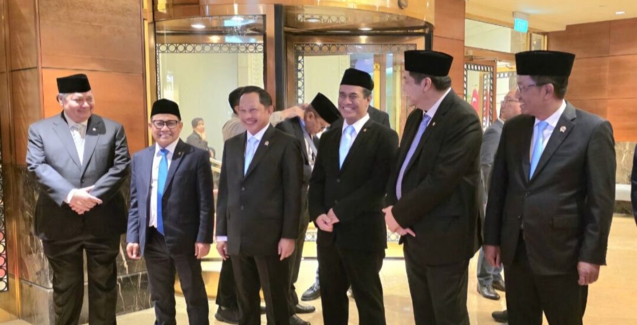 Menko Ekon Airlangga, Menko Pemberdayaan Masyarakat Muhaimin, Mendagri Tito, Mentan Amran, Menpera Maruarar dan Menkum Supratman saat menanti kedatangan Presiden di Fullerton Hotel, Singapura, Ahad 15 Juni 2025 malam. (Foto : Uca)