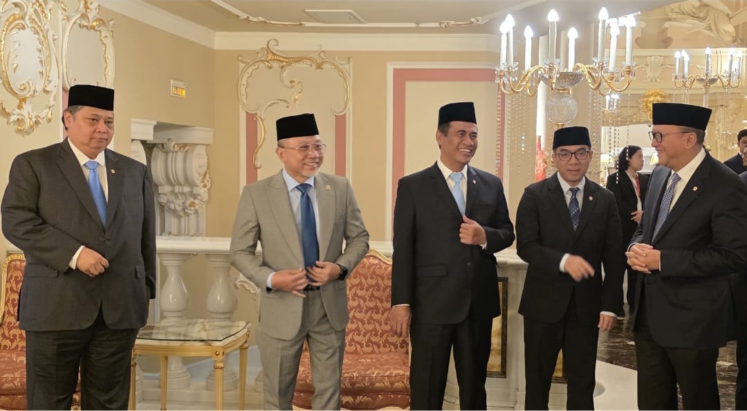 Menko Ekonomi Airlangga, Menko Pangan Zulhas, Mentan Amran, Mendiktisaintek Brian, dan Meninvest Rosan saat bersiap menanti kedatangan Presiden di St. Petersburg, Rusia, Rabu 18 Juni 2025.
