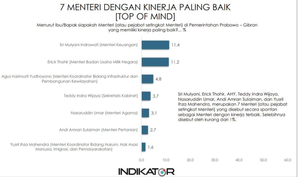 Berikut daftar menteri yang dianggap publik berkinerja baik versi survei Indikator: