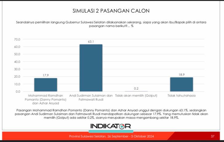 Sebagai informasi, Lembaga Survei Indikator melakukan riset pada tanggal 26 September hingga 3 Oktober 2024 untuk pemilihan Gubernur Sulsel.