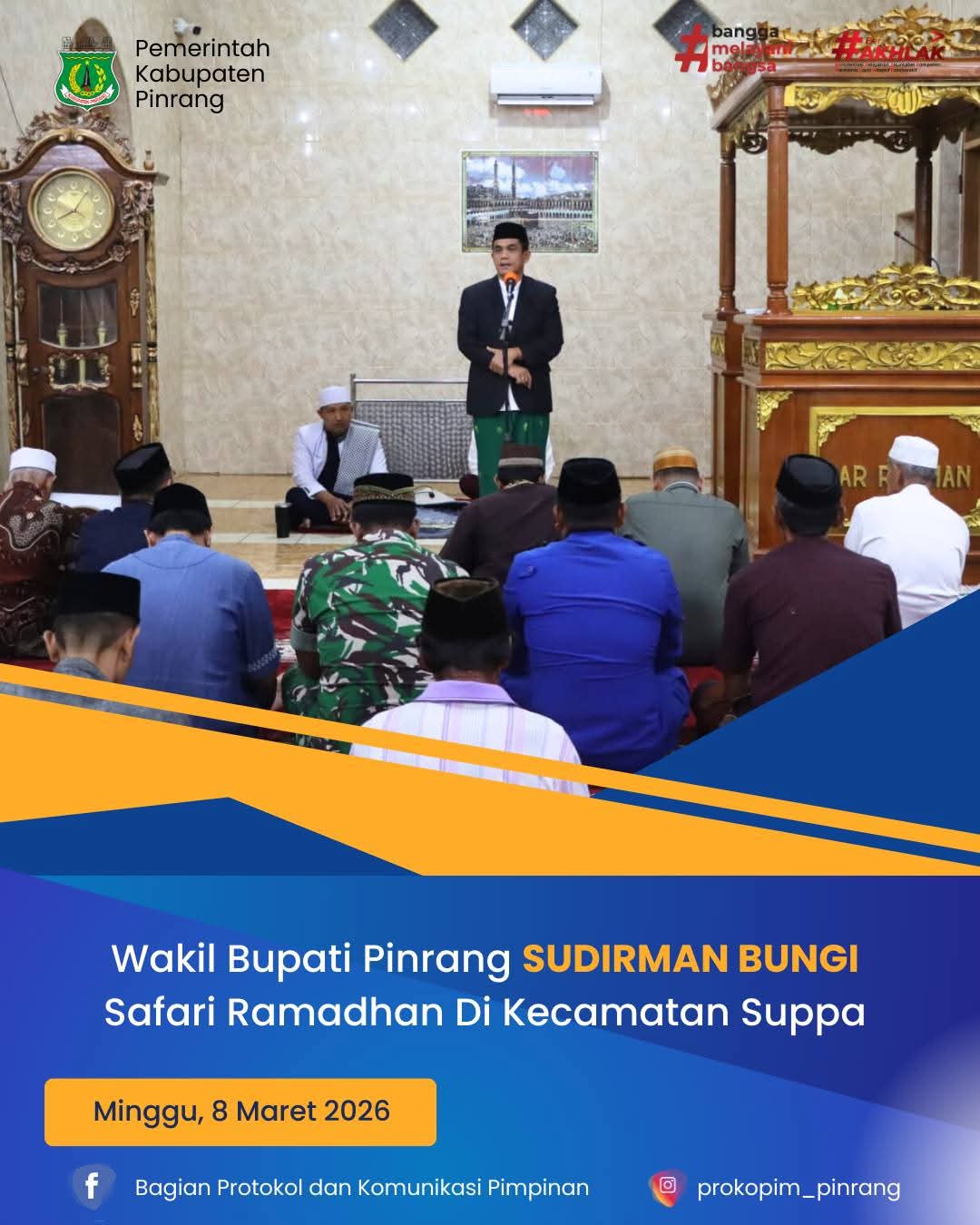 MEGATRENDNEWS.ID, PINRANG – Tim Safari Ramadhan Pemerintah Kabupaten Pinrang kembali melanjutkan rangkaian kegiatan Safari Ramadhan 1447 H dengan mengunjungi Kecamatan Suppa. Kegiatan ini dipimpin langsung oleh Wakil Bupati Pinrang Sudirman Bungi, didampingi Sekretaris Daerah Kabupaten Pinrang Andi Tjalo Kerrang, bersama rombongan pejabat lingkup Pemerintah Kabupaten Pinrang, Minggu (8/3/2026).